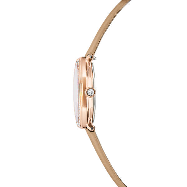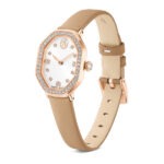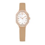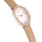 Inspiriran Crvenom bezvremenskom elegancijom obitelji Dextera, ovaj sat dimenzija 18 x 23 mm jedinstveno je izrađen u Swarovskijevom kultnom osmerokutnom obliku. Izrađen od nehrđajućeg čelika s završnom obradom u Rozo Zlatna tonu, dizajn ima pavé okvir ukrašen sa 46 kristala i dodatni Kristal ukrašen unutar krunice. Brojčanik sa sunčevim zrakama također uključuje nježne Kristal indekse, zajedno s vitkim kazaljkama i logotipom labuda na 12 sati. Kako bi se upotpunila ova blistava kreacija, sat dolazi na Smeđa kožnom remenu. Ovaj sat proizveden u Švicarskoj vodootporan je do 50 m.