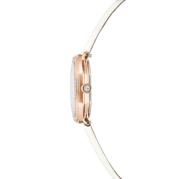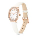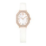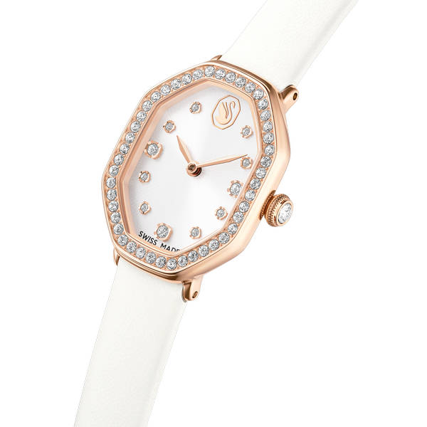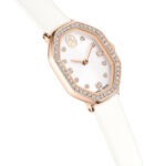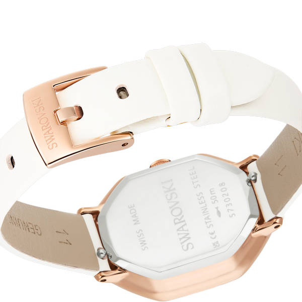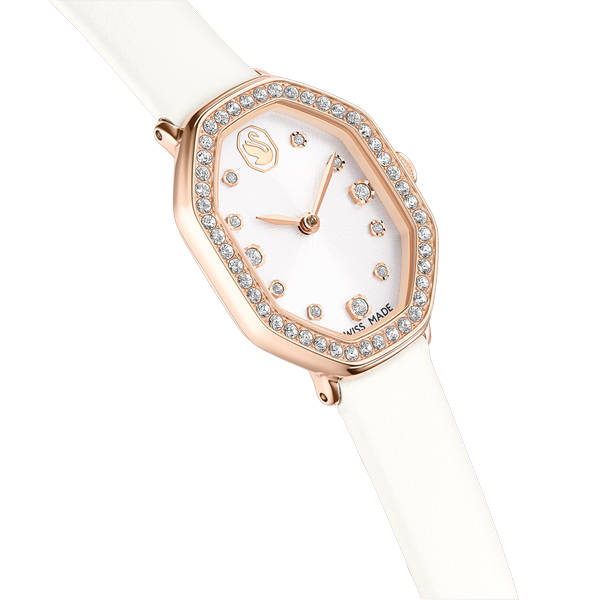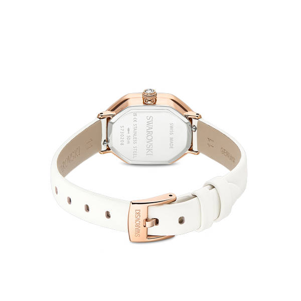 Inspiriran Crvenom bezvremenskom elegancijom obitelji Dextera, ovaj sat dimenzija 18 x 23 mm jedinstveno je izrađen u Swarovskijevom kultnom osmerokutnom obliku. Izrađen od nehrđajućeg čelika s završnom obradom u Rozo Zlatna tonu, dizajn ima pavé okvir ukrašen sa 46 kristala i dodatni kristal ukrašen unutar krunice. Brojčanik sa sunčevim zrakama također uključuje nježne Kristal indekse, zajedno s vitkim kazaljkama i logotipom labuda na 12 sati. Kako bi se upotpunila ova blistava kreacija, sat dolazi na bijelom kožnom remenu. Ovaj sat proizveden u Švicarskoj vodootporan je do 50 m.