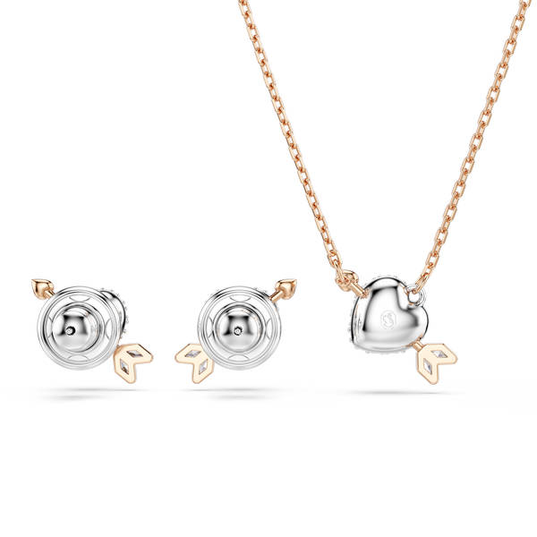 Unesite strast u svoj stil ovim svjetlucavim privjeskom i setom Naušnica. Svako srce obloženo rodijem ukrašeno je prozirnim kristalima i probodeno je strijelom u tonu Cupid Rozo Zlatna. Jedinstvena kombinacija za dane kada ljubav zaslužuje sjati.