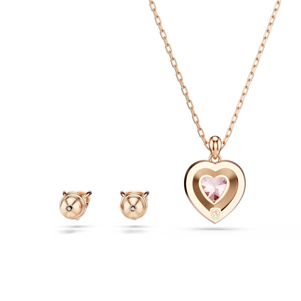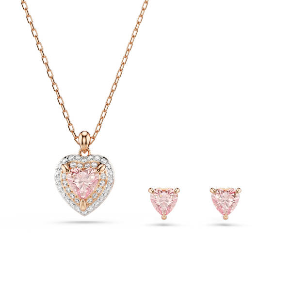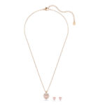 Unesite harmoniju u svoj stil ovim romantičnim privjeskom i setom naušnica marke Swarovski. Privjesak u obliku srca izrađen je od živopisnog Roza Swarovski cirkona okruženog okvirom od prozirnog pavéa u nekoliko slojeva. Tome se pridružuje par nježnih Roza naušnica koje uljepšavaju izgled svjetlošću i bojom.